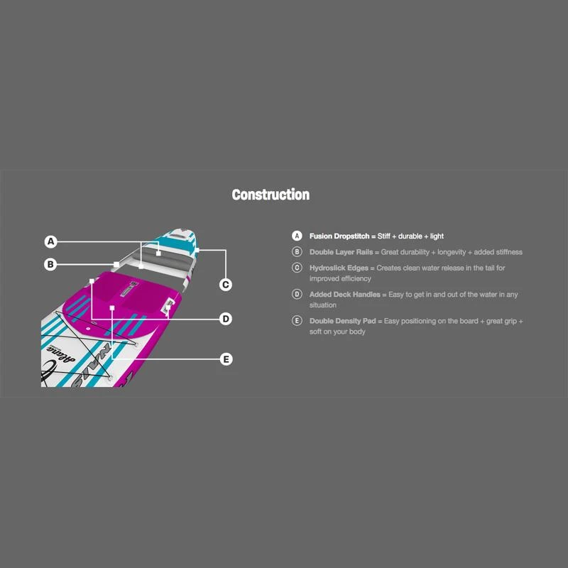 Cotés construction, cette board dispose de la nouvelle Fusion Dropstitch construction qui permet une meilleure solidité et rigidité tout en diminuant son poids. La Alana 11’6″ est aussi équipée de l’hydroslick edge un matériaux spécifiquement développé et stratégiquement placé le long du tail qui permet un meilleur écoulement de l’eau pour une glisse optimisée, le pads double densité quand à lui offrira un super grip et un maximum de confort.