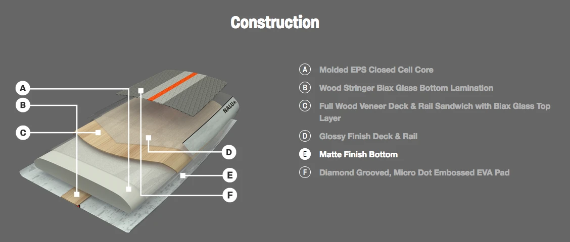 La Nalu GTW est équipée d’un noyau mousse EPS, d’une construction sandwich bambou et fibre de verre ainsi que de renforts sur le pont, ceci donne une planche légère mais solide.
