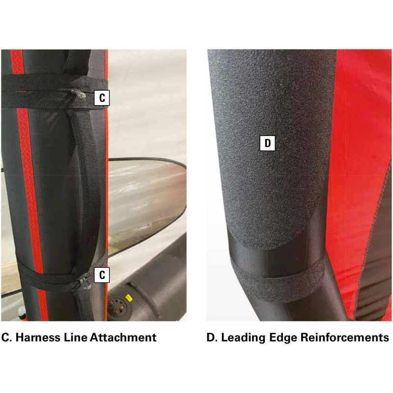 La jambe de force et le bord d’attaque plus épais permettent de délivrer une grand puissance qui facilitera les demarrages, ce diamètre du bord d’attaque se réduit progressivement en allant sur les extrémités afin de rendre l’aile maniable et d’augmenter sa vitesse.