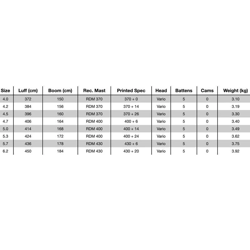 - Taille 5.0 – Luff 414 cm – Boom 168 cm – Rec Mast RDM 400 – 400 + 14 – Head Vario – Battens 5 – Cams 0 – 3.49 kg