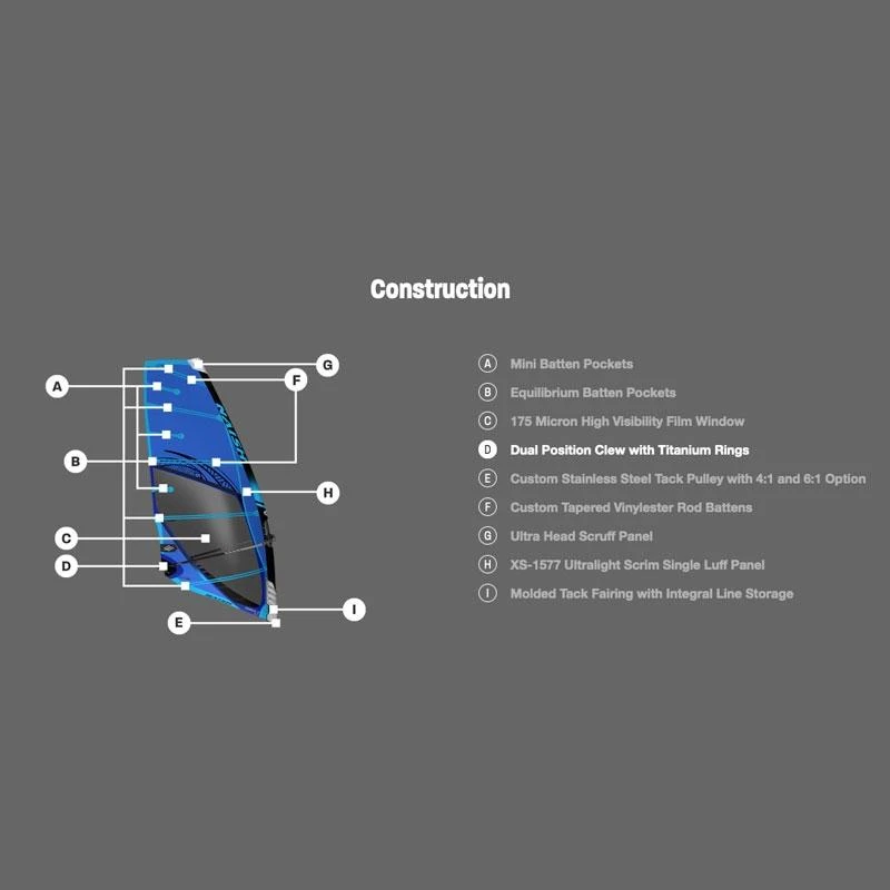 Cette année elle bénéficie du nouveau X-51577 un tissu tramé des deux cotés ultra résistant aux chocs et aux déchirures mais dont les propriétés de poids reste trés réduites. Il en résulte une voile solide et légère.