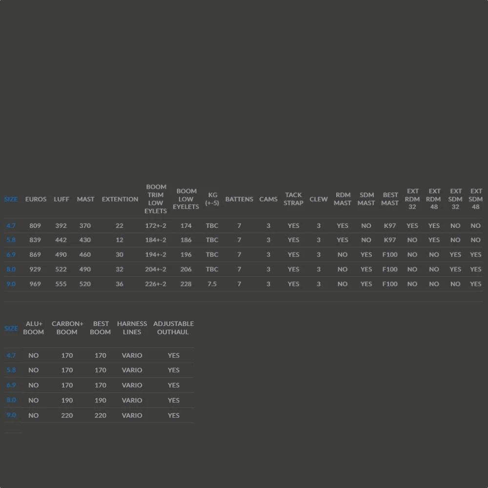 Le guindant a été élargi de 5 cm dans les petites tailles et de 7 cm dans les 2 plus grandes tailles, augmentant la stabilité et la puissance par vent léger. Les formes des lattes ont été retravaillées pour faire avancer le profil. La tête de la voile est plus petite pour une sensation plus légère et moins de traînée.