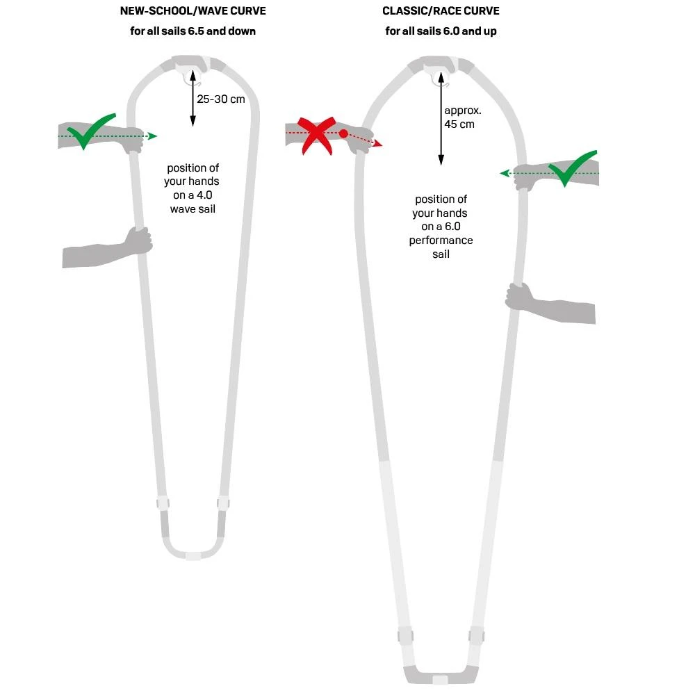 Les longueurs orientées pour une programme vague (140/190, 150/200) ont un diamètre de 28mm et ont une courbure qui optimise la répartition des charges entre la main avant et arrière. Le 160cm et le180, plus destiné aux voiles freeride, ont un diamètre de 30mm pour plus de rigidité.