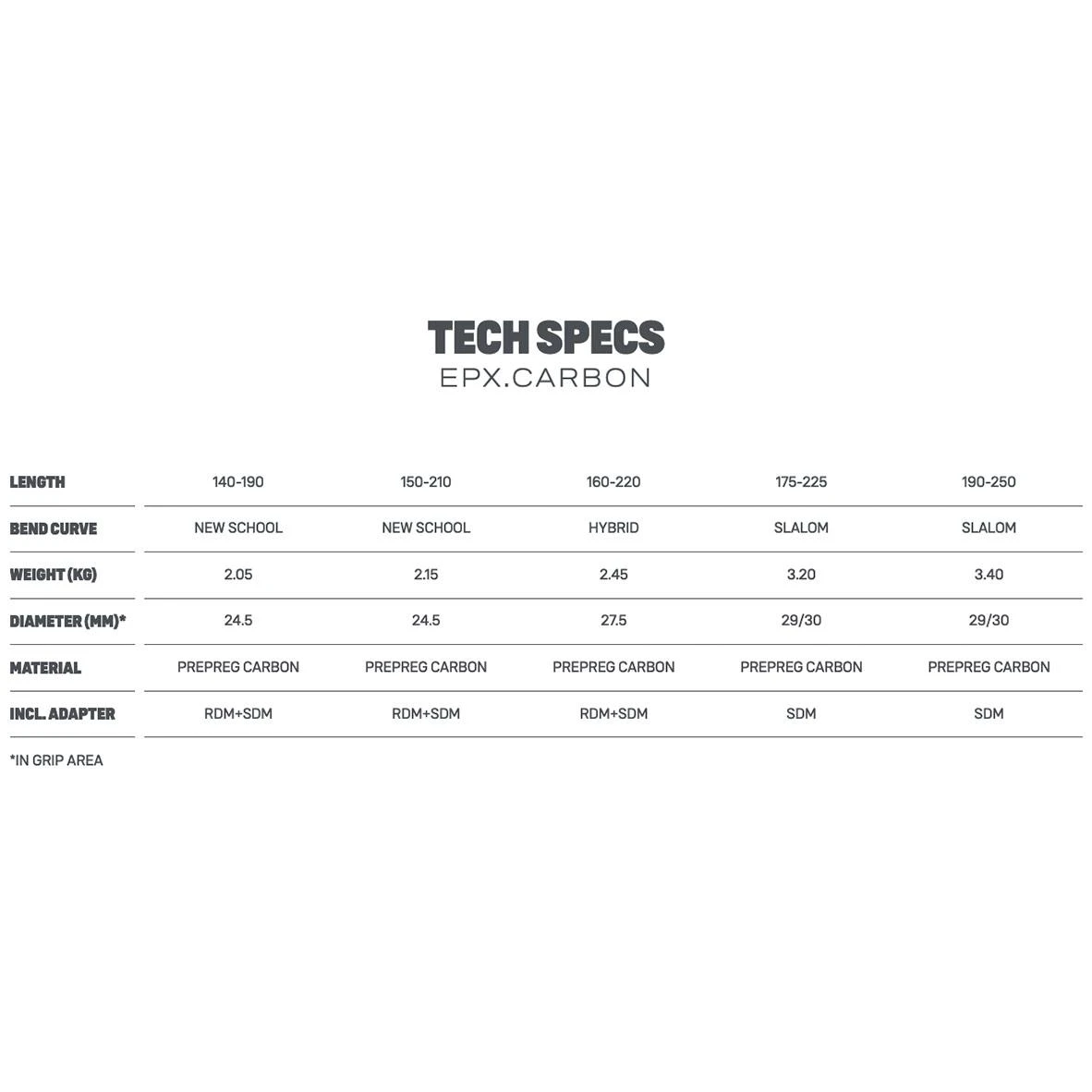 - Vague > Freeride (160): Longueur 160 cm avec tubage 27,5 mm, courbure hybride et poignée arrière carré pour voiles de vague/freeride